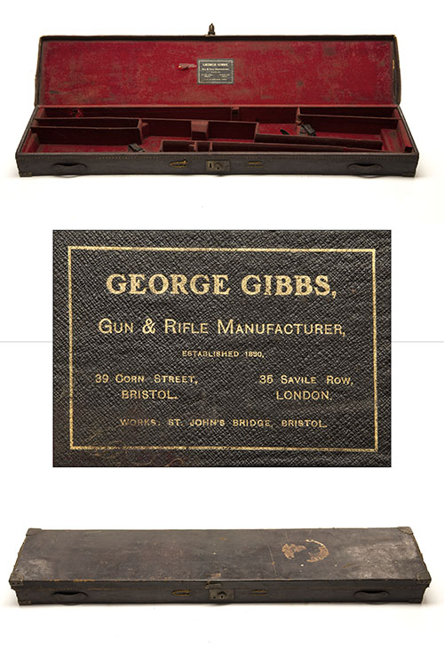 fitted for two 47in. rifles, the interior lined with red baize, a George Gibbs trade label, brass lock (needs attention, key missing), handle needs attention, the lid exterior with the initials 'R.W.M.'