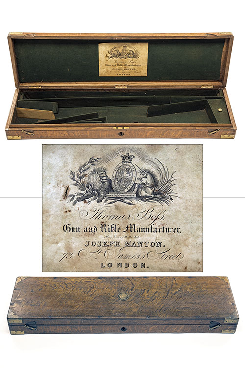 fitted for a 32in. barrel, the interior lined with green baize (moth damage cut out), a Thomas Boss trade label, brass lock (key missing), two brass clasps, the lid exterior with a central brass escutcheon