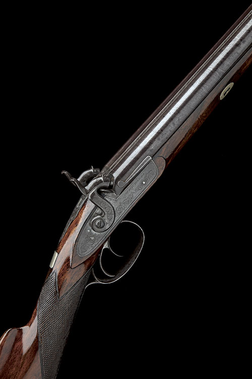 * A LONG-BARRELLED 12-BORE PERCUSSION DOUBLE-BARRELLED SPORTING-GUN SIGNED 'W. RICHARDS', no visible serial number,