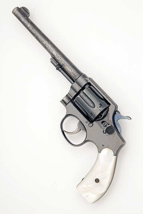 late second, early third model with 6 1/2in. barrel, the top signed and with patent dates to 1906, crescent fore-sight, sighting groove to the top-strap, swing-out fluted cylinder, mother of pearl grips (probably factory), the whole with a strong amount of finish