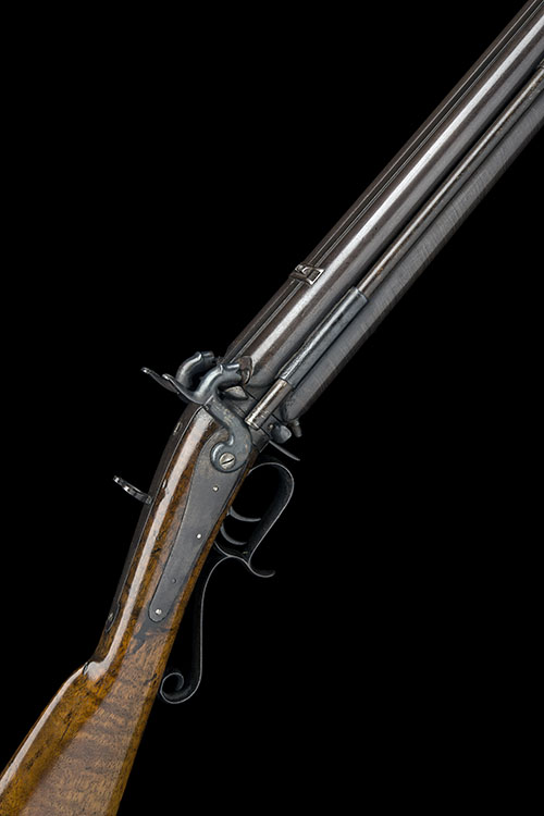possibly American, with 27in. barrel-group, the side by side shot barrels of twist iron, the heavy rifle barrels of iron, each pair with their own front and rear-sights, the rotation locked by an auxilliary trigger forwards of the guard, plain back-action locks, winged tang sight, walnut butt-stock of 'Kentucky' form with iron crescent heel-plate, raised trigger-guard lower tang, spurred bow and ramrod stored alongside barrel