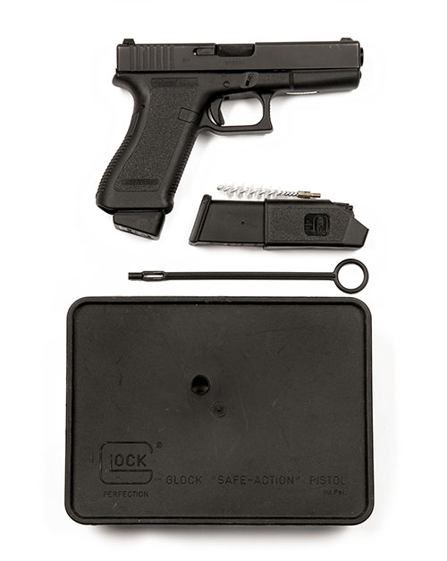 with ported 4 1/2in. barrel, black phosphated lightened slide with make and model details, selector for burst fire or single shot to left hand side, black stippled polymer frame, trigger-blade safe and extended magazine, complete with its maker's abs plastic carton and spare standard magazine, together with a cleaning rod a magazine loader