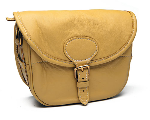 AN UNUSED YELLOW LEATHER SUEDE LINED CARTRIDGE BAG,