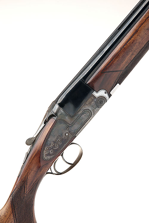 ARMITALIA DI LUCCHINI 12-BORE DOUBLE-TRIGGER SIDEPLATED OVER AND UNDER EJECTOR, serial no. 7681, 27in. nitro barrels with 6mm ventilated matt top-rib, 2 1/2in. chambers, bored approx. 1/4 and 1/2 choke, hold-open toplever, manual safety, border engraving, the decorative sideplates with dummy lockpins and tumbler pivots, retaining some colour-hardening, 14 3/8in. semi-pistolgrip stock with Prince of Wales grip and cap, raised comb and trademarked buttplate