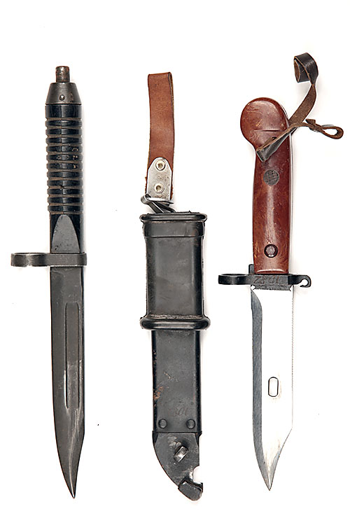 A RUSSIAN AK47 BAYONET TOGETHER WITH AN EXAMPLE FOR A GERMAN G3, the second probably Pakistani and missing scabbard, the first complete with frog (2)