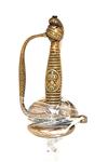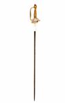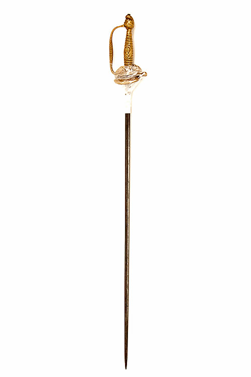 A BRASS HILTED FRENCH COURT-SWORD, circa 1860, with straight 29in. blade, turned back embossed shell-guard, 'D' shaped knuckle-bow and ribbed grip with crested bulbous pommel (hilt loose)