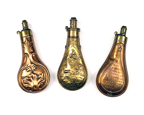 THREE VICTORIAN POWDER-FLASKS, differing designs, two with minor seam splits, one with frozen thumb-piece (3)