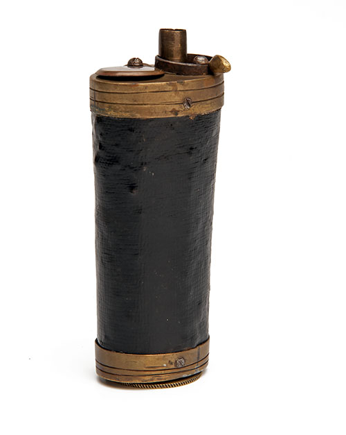 unsigned, circa 1800, with slightly tapering leather covered body (some corrosion below the leather), brass end-caps engraved with tramlines, the base with circular screw-off lid to the flint compartment, the top with swing cover to the ball compartment and plain nozzle with exposed replacement mainspring