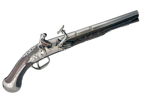 probably Tuscan circa 1680, with tapering octagonal to round 9 1/4in. triple-stage barrel banded at the intersections, solid squared top-tang fixed from beneath, slightly curved and radiused lock with grotesque carved to the pointed tail, hammer internally fixed, steel with automatic pan cover and serpentine carved mount, walnut full-stock with carved borders around the iron furniture, long-spurred butt-cap (engraved detail rubbed), engraved trigger-guard bow with half trigger-plate, complex pierced side-plate with en-suite mount around the top-tang, turned and pierced ramrod pipes and original wood ramrod with pinned and reinforced tip, cleaned overall