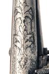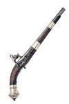 Southern Russia or Corsican circa 1790, with 12 1/2in. iron barrel, semi octagonal form breech-section with arabesque engraving (rubbed), plain miquelet lock with small ring top to the hammer, solid top-tang with integral back-strap, figured walnut three-quarter stock, substantial domed white-metal pistol-grip cap with central iron rosette and lanyard swivel, bone escutcheons to the back-strap and side nails, further bone escutcheon to the guardless ball trigger and two broad plain white-metal barrel-bands, no provision for ramrod