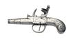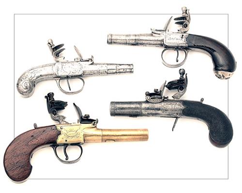 all last half of the 18th century, the first an all brass 54-bore with round 2 1/8in. barrel, squared central hammer action engraved with stands of flags and signed 'DUTTON, LONDON', slab-sided walnut butt and guarded trigger; the second with iron 60-bore 1 1/2in. cannon barrel, squared central hammer, iron action signed 'ARCHER, LONDON', swollen walnut butt with silver grotesque-mask cap hallmarked for Birmingham 1785 by maker Charles Frith and guarded trigger; the third an all iron type signed 'SEGLAS (sic.), LONDON' with unproved1 1/4in. cannon barrel (frozen), engraved iron action and butt (rubbed) and guarded trigger; the last of rounded form and signed 'W.A. BECKWITH, LONDON', 1 1/2in. barrel with engraved bands, trophy engraved action with concealed folding trigger and chequered bag-shaped butt, the first two with London proofs, the last Birmingham