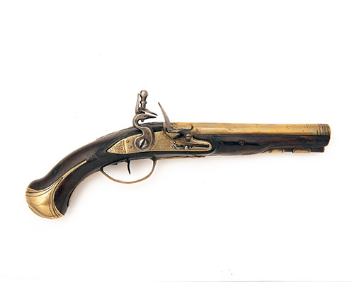 A 22-BORE FLINTLOCK BRASS-BARRELLED SASH-PISTOL, no visible serial number,
