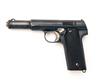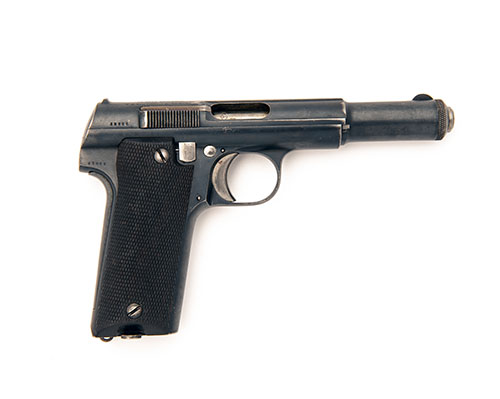 Chilean contract circa 1944, with concealed 5 1/4in. barrel, rounded blued slide with cylindrical barrel-cover marked 'FUERZA AEREA DE CHILE' below a winged shield with central star device, fixed sights, hammerless action with grip safety, chequered walnut grips, lanyard ring at heel, maker marked magazine, much original blued finish remaining