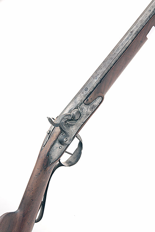 Continental, circa 1770 with later conversion to percussion, with two-stage 38in. barrel, plain radiused lock retaining remenants of the pan, handrail half-stock cut back from full, iron furniture and ribless barrel (thimbles absent, later ramrod)
