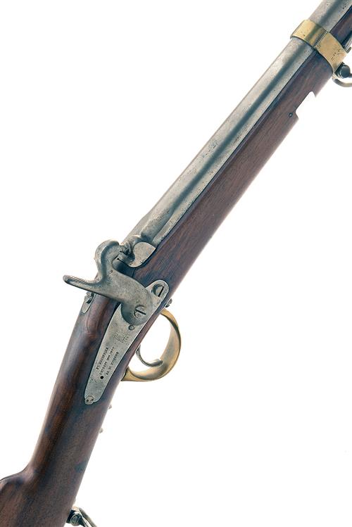 formed from a French service arm, with 19in. iron barrel, strongly flared muzzle, military back-action lock and walnut full-stock with brass military furniture