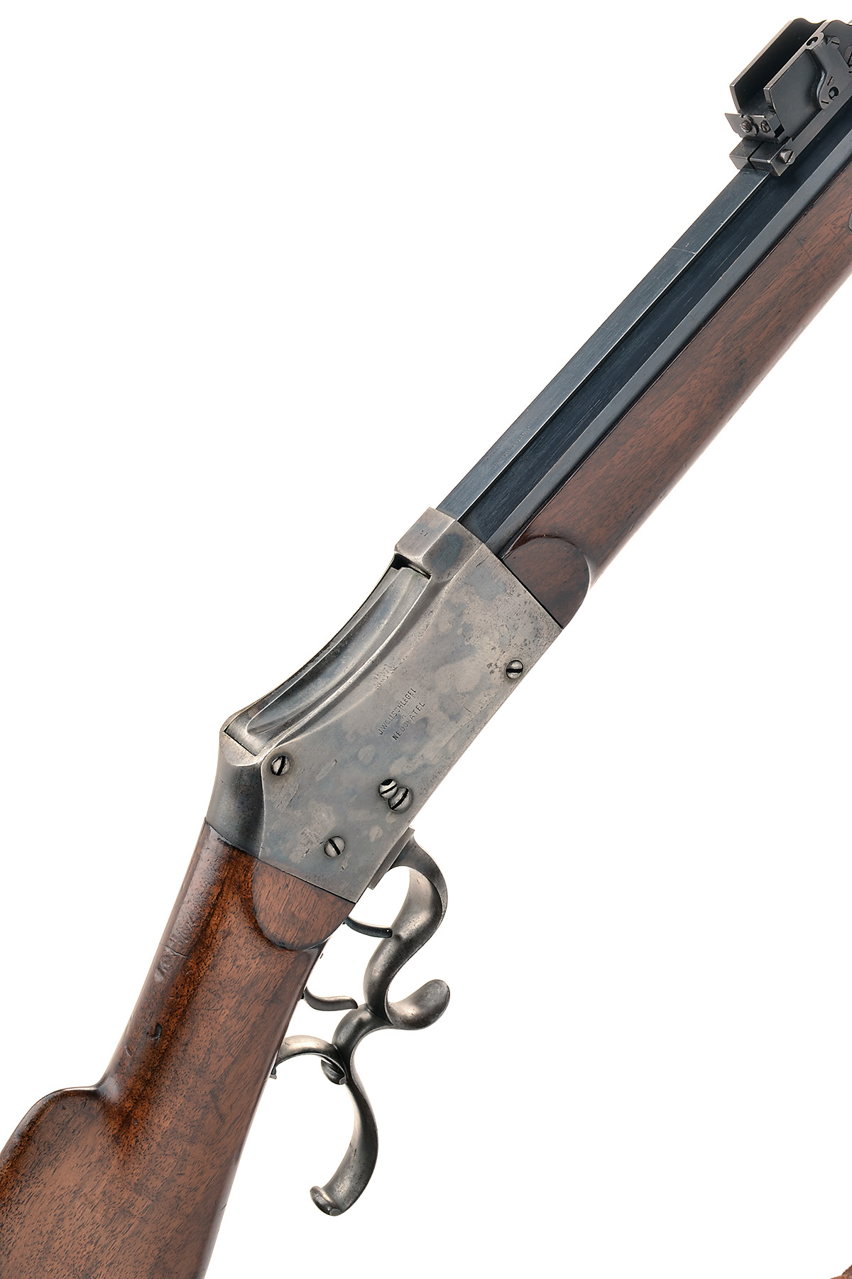 with blued octagonal 33 1/4in. barrel signed on the top-flat 'J. WOLLSCHLEGEL NEUCHATEL', adjustable sights, plain action signed as barrel, no provision for peep-sight at wrist, Swiss style walnut butt with raised cheek-piece and hooked heel-plate, complex trigger-guard forming the under-lever, double set triggers and walnut fore-end, fitted with a basket-weave leather sling