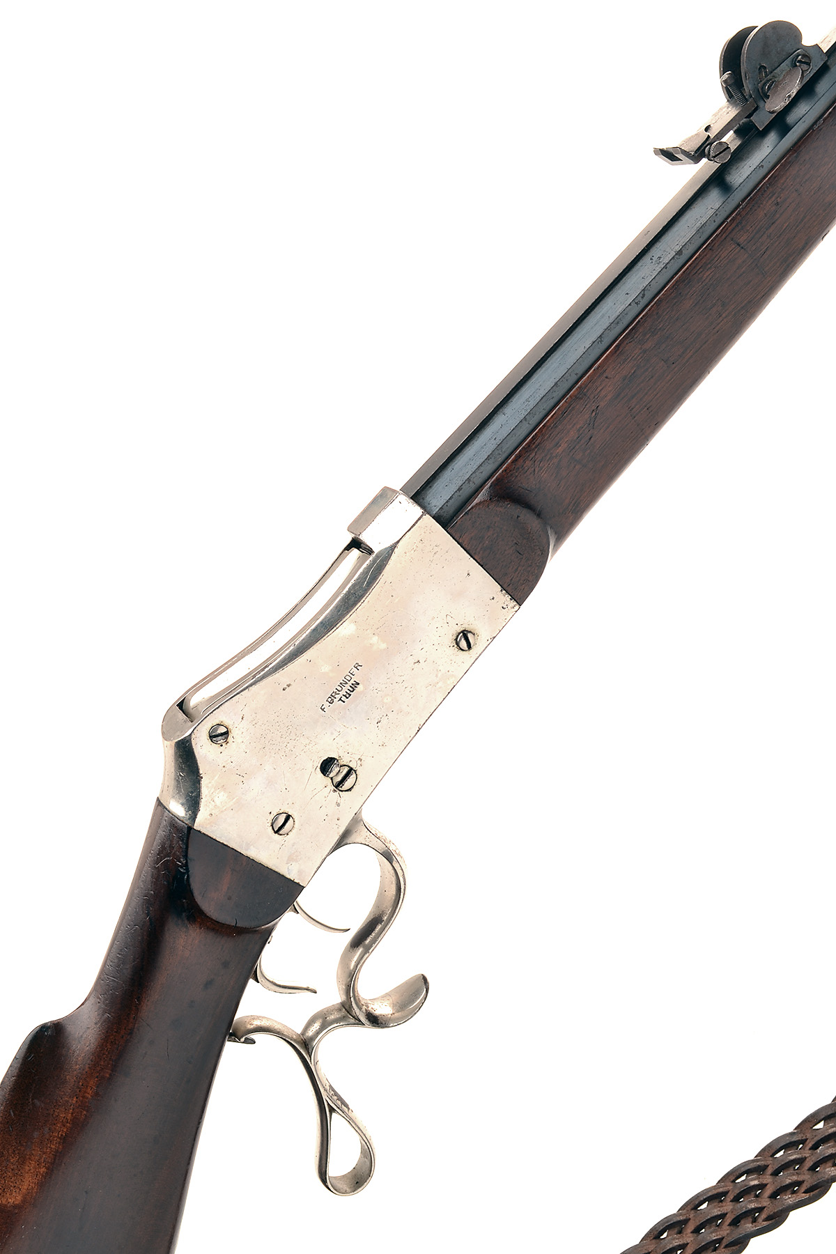 with blued octagonal 34 1/4in. barrel, adjustable sights, plain nickel-plated action signed 'F. GRUNDER, THUN', no provision for peep-sight at wrist, Swiss style walnut butt with raised cheek-piece and hooked heel-plate, complex trigger-guard forming the under-lever, double set triggers and walnut fore-end, fitted with a basket-weave leather sling