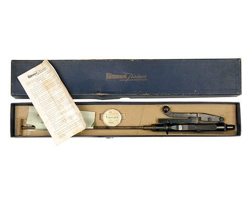 circa 1950, with 14 1/2in. brass barrel, blued air-chamber with integral six-shot magazine with rotating cover, the body of the device marked 'HAMMERLI TRAINER MOD K31', 'PATENT' ('Hammerli Trainer' with gilt infill) and the serial number (some scratches to finish), side-lever cocking with bakelite toggle in imitation of the rifle together with its blued top-clamp and complete in its maker's blue card carton with paste-board insert, a partial tin of Hammerli BBs, instructions and warning leaflet (German language)