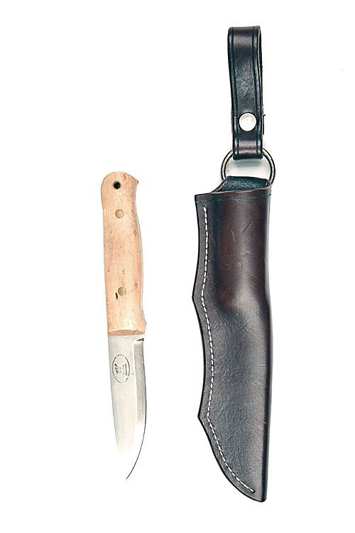 A GOOD BRITISH BUSHCRAFT HUNTING KNIFE SIGNED WALKER, recent, with carbon steel 4 1/4in, drop-point blade signed 'WALKER, ENGLAND' together with the 'W' trademark, smooth birchwood scales fixed with two brass pins, brass lined lanyard aperture at pommel and complete with its blocked leather scabbard with swivel belt-loop, the whole appearing unused