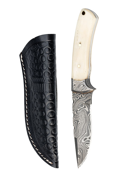 circa 2010, with lemon-etched drop-point 4in. blade false edged for the last 1 3/4in., fully scalloped back edge and back-strap, pinned damascus bolsters, polished antler scales held by two brass pins and brass lined lanyard loop aperture, complete with its embossed black leather scabbard with white stitching