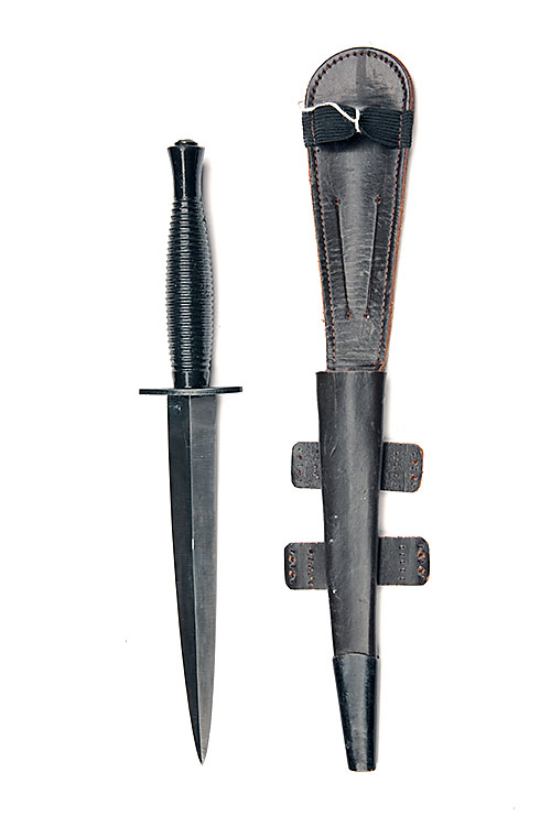 A RECENT ISSUE FAIRBURN-SYKES MILITARY KNIFE, of MKIII type with black painted ribbed hilt with cross-keys mark, oval cross-guard and blacked 6 3/4in. double-edged blade, complete with its leather sleeve scabbard, all appearing little used