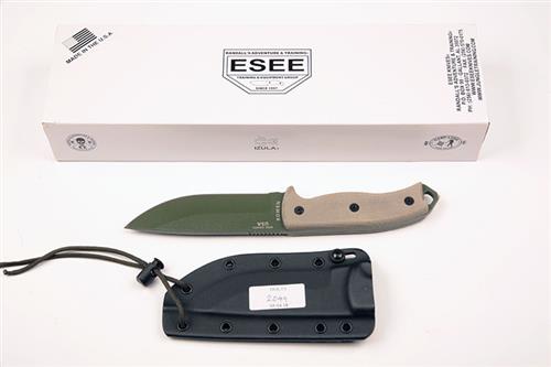 A BOXED, NEW & UNUSED PROFESSIONAL QUALITY SURVIVAL-KNIFE SiGNED ESEE, MODEL 'ESEE-5S', serial no. 31221, specifically designed by military instructors for survival use by downed pilots, with transferable lifetime warranted drop-point 1095 carbon steel 5 1/4in. blade with green corrosion resistant coating, grooved thumb-rest to back of blade, slab-sided non-slip micarta scales machine-screwed to the full-tang, hardened lanyard loop to pommel, complete with its 'Kydex' plastic adjustable sheath with choice of mountings, papers and maker's carton