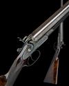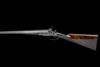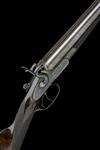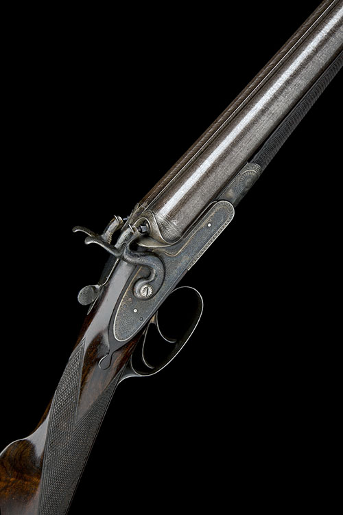 29 5/8in. black powder only bold damascus barrels, rib engraved 'E. & F.G. DODSON 14 UPGATE. LOUTH.', 2 1/2in. chambers, bored approx. true cyl. choke in both, Thomas patent action, patent no. 324 of February 4th 1870, carved percussion fences, broad toplever, rebounding sidelocks with dolphin hammers, floral and acanthus scroll engraving, retaining much renewed colour-hardening, 14 1/4in. figured stock with engraved steel heel and toe plates, fore-end with early Anson push rod release, patent no. 953 of 1873, use number 454, weight 6lb. 12oz.