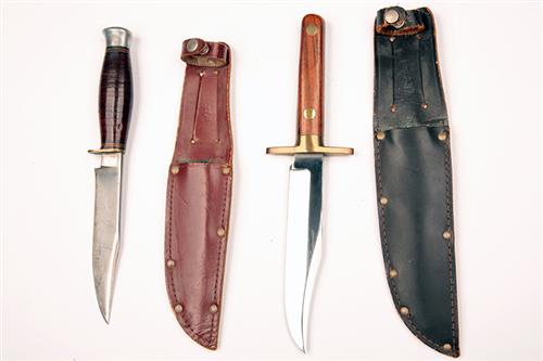 TWO SHEFFIELD BOWIE KNIVES, one signed 'WILLIAM RODGERS' and with brass mounted wood hilt, the other with traces of etched signature to blade and leather handle, both with scabbards (2)