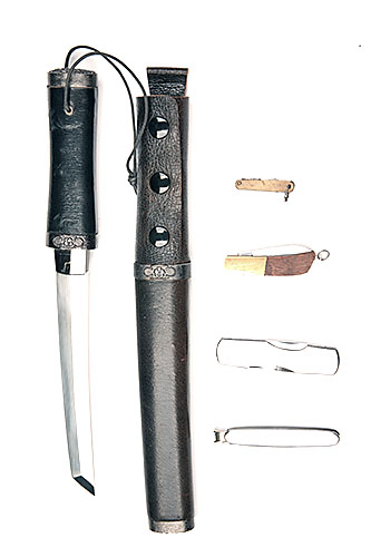 A SMALL COLLECTION OF FOUR FOLDING POCKET-KNIVES TOGETHER WITH A REPRODUCTION JAPANESE KAMIKAZE-PILOT'S DAGGER, the first ranging from 1 1/2in. folded to 3 3/8in, two of multi-blade style, the last 12in. overall in its scabbard (5)