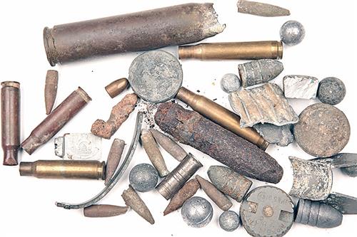 A TIN OF ASSORTED SPENT BULLETS, GRENADE PARTS AND BULLET CASINGS, mostly World War Two vintage, some excavated (qty)