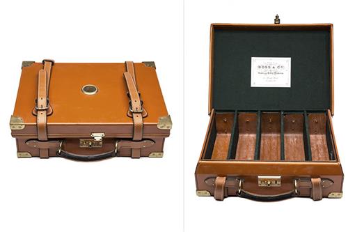 for approx. 300 cartridges, the interior lined with green baize, a Boss & Co. trade label, five leather lifters, four fixed dividers, brass lock (including key)