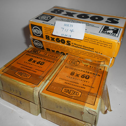 ONE HUNDRED AND TWENTY 8 X 60S RWS CARTRIDGES comprising of four retail cartons of twenty H-mantle 12.1gram /187grain copper hollow nose, and four retail cartons of ten rws 8mm x 60s 187 grn sp