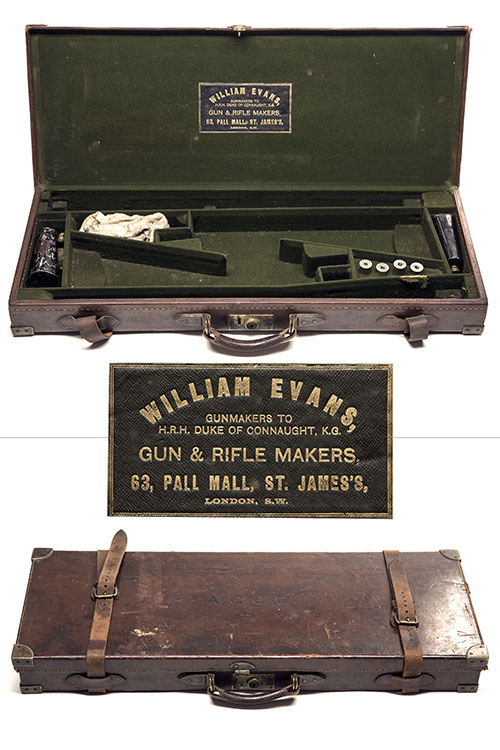 fitted for 28in. barrels (could adapt to 29in.), the interior lined with green baize, a leather gold-tooled William Evans trade label, brass lock (key missing), the lid exterior with the monogram 'A.C.C.C.'