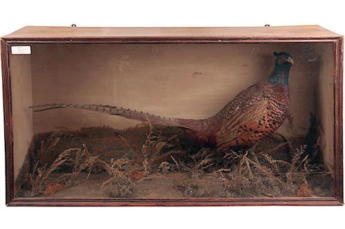 A VINTAGE CASED FULL MOUNT OF A PHEASANT, glazed wooden case, measuring approx. 32in. x 18 1/2in.
