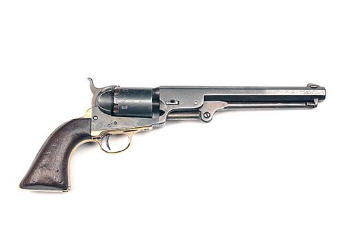 A .36 PERCUSSION REVOLVER SIGNED METROPOLITAN ARMS, MODEL 'NAVY', serial no. 2831, circa 1865, in imitation of the Colt 1851 Navy (q.v.), with octagonal 7 1/2in. barrel, open iron frame, plain cylinder (no trace of scene) and brass grip-straps with smooth walnut grip, some frosting to exposed iron surfaces