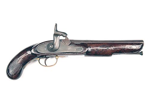 A 28-BORE PERCUSSION HOLSTER-PISTOL, UNSIGNED, no visible serial number, cut down from a musket for Colonial use, with iron 9in. barrel, plain military style lock and walnut full-stock with chequered bag-shaped butt