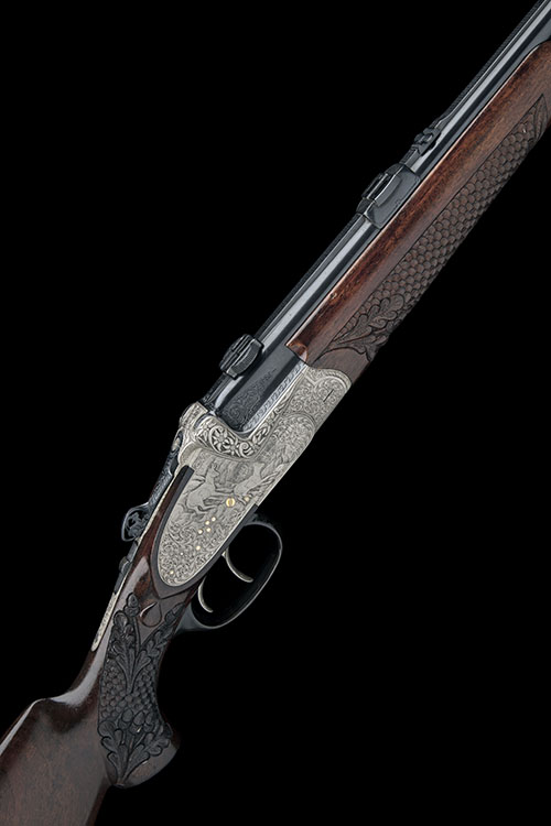 24 3/8in. Bohler Rasant-steel nitro reproved (in 2018) barrels with raised file-cut rib, flip-up open sights and ramped bead fore-sight, the breech end mounted with a Zeiss Diavari-Z 1,5...6x42 telescopic sight, serial no. 1489772, in quickly-detachable mounts, 3in. shot chamber, bored approx. 1/2 choke, lightweight quadruple-grip action with florally-engraved side-bolsters, the toplever pierced with an Alpine ibex, manual safety, hand-detachable lockplates with concealed flush release lever, cocking-indicators, gold-washed pins and internals, set triggers, horn triggerguard, bold Germanic scroll engraving surrounding game scenes of roe deer, chamois and capercaillie, old silver finish, 14 3/8in. figured pistolgrip stock with sculpted cheekpiece, horn pistolgrip-cap, sling swivels, the hand and fore-end with fish scale chequering and carved with oak leaves and acorns, including 7/8in. ventilated rubber recoil pad, weight 6lb. 12oz. (unscoped) and 8lb. 2oz. (with scope), in a case