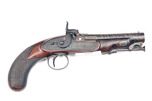 A 28-BORE PERCUSSION OVERCOAT PISTOL SIGNED WILKINSON, LONDON, no visible serial number, circa 1845, with twist barrel signed by the maker (rubbed, traces only), platinum line and plug at breech, border and scroll engraved bar-action lock signed 'WILKINSON', sliding safe behind the hammer, walnut full-stock with chequered bag-shaped butt and captive iron ramrod