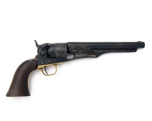 for 1864, with 8in. round, sighted barrel signed 'ADDRESS COL. SAML COLT NEW-YORK U.S. AMERICA' (rubbed), plain stepped cylinder scrubbed of roll engraved scene, open iron four-screw frame marked 'CSA' and 'COLT'S PATENT', provision for shoulder-stock, brass trigger guard stamped '.44 CAL', iron backstrap, walnut grip with martial cartouche, refinished and some numbers erased or partially erased