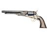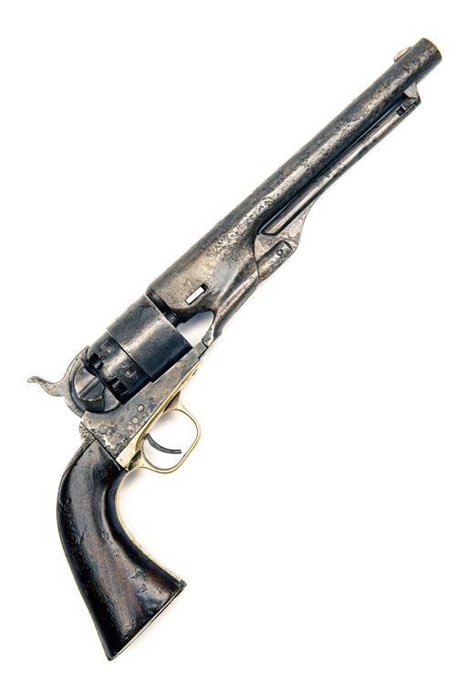 for 1861, with 8in. round, sighted barrel originally signed 'ADDRESS COL. SAML COLT NEW-YORK U.S. AMERICA' (only partially legible), amateur replacement wedge, plain stepped cylinder scrubbed of naval scene, open iron frame marked 'COLT'S PATENT', cut-outs on recoil shield and heel for shoulder-stock, brass trigger guard, iron backstrap, smooth walnut grip, refinished throughout, pitting, some deep