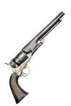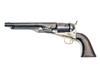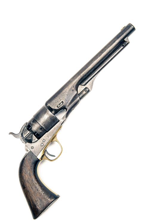 for 1863, with 8in. round, sighted barrel signed 'ADDRESS COL. SAML COLT NEW-YORK U.S. AMERICA', plain stepped cylinder roll engraved with a naval scene and stamped with an inspector's initial 'W', open iron frame marked 'COLT'S PATENT', cut-outs on recoil shield and heel for shoulder-stock, brass trigger guard stamped '.44 CAL', iron backstrap, smooth walnut grip with traces of a martial cartouche, minimal traces of original finish