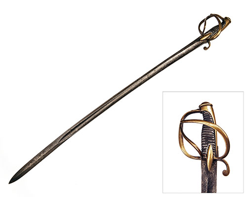 probably French, circa 1830 and probably manufactured in Solingen, with curving 35 1/4in. blade, broad fuller to both sides and etched with trophies and scrolls (worn), three-bar brass hilt with applied boat-shaped langets, turned down quillion with disc end, ribbed grip (binding absent) and brass capped back-strap, no scabbard