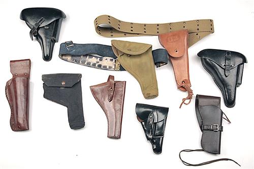 NINE ASSORTED HOLSTERS, mostly military types including a Canadian issue Pattern '37 webbing holster for a .455 Webley, reproduction 'P38', 'Luger' & 'PPK' hardshells and a Colt 1911A1 type amongst others, two with webbing belts attached (9)