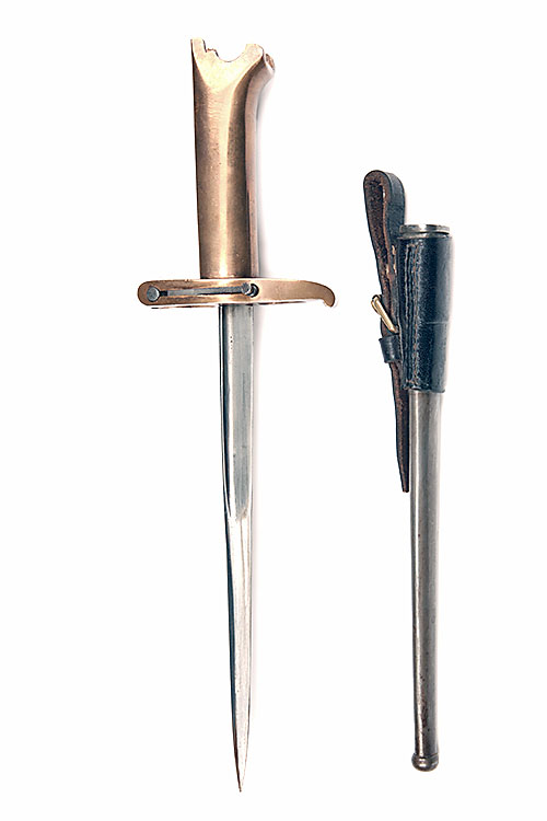 A REPRODUCTION GREENER-PRITCHARD WEBLEY REVOLVER BAYONET, designed for the MKVI service revolver, with bronze hilt, blade formed from a French Gras bayonet and iron scabbard with leather frog