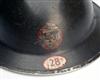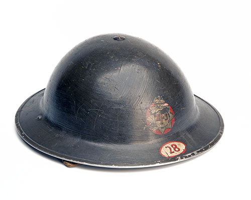 A WORLD WAR TWO BRITISH 'BRODIE' STEEL HELMET DECALLED FOR THE NATIONAL FIRE SERVICE, dated for 1938, olive green painted finish with NFS decalled badge to crown and the number '28' to brim, with liner and chinstrap
