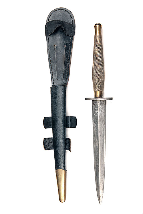 A REPRODUCTION MKII F.S. MILITARY KNIFE, of usual form (blade cleaned of finish), the forte etched 'THE F.S. FIGHTING KNIFE', thick iron boat-shaped cross-guard stamped with a crown broad-arrow device and the letter 'I', roll chequered brass hilt and later replacement leather scabbard