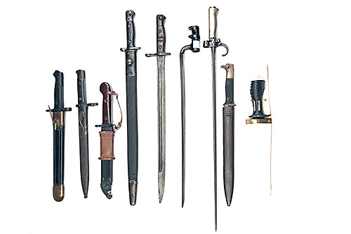 A COLLECTION OF NINE ASSORTED WORLD BAYONETS including a British Pattern '53 socket bayonet (no scabbard), a derelict seitengewehr 14 with the saw-back ground off, a Pattern '07, an example for an SA80 in a parade scabbard, another for an AK47, a cut-down Italian type, a Mannlicher type with reversed cutting edge, a US P17 (no scabbard) and a French Lebel cruciform bayonet (excavated, no scabbard) (9)