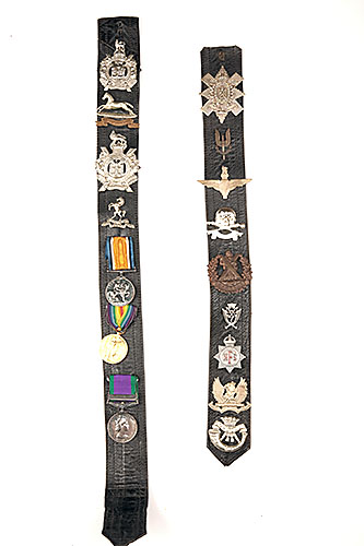 FOUR LEATHER BELTS OF MOSTLY GENUINE MILITARY CAP-BADGES AND MEDALS, including a 1962 G.S.M. with bar for Northern Ireland, a WW1 pair to a private in the R.W. KENT Regt., a further 46 mostly genuine cap-badges plus assorted collars and buttons