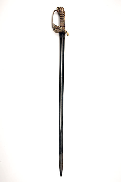 A BRITISH NAVAL OFFICER'S SWORD, late Victorian, with etched blade (tarnished) and brass guard with lionshead pommel, no scabbard
