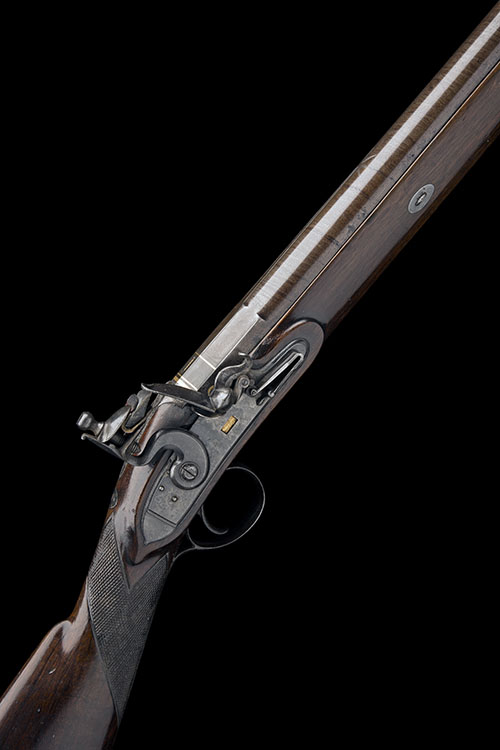 A 5-BORE FLINTLOCK SINGLE-BARRELLED FOWLING-PIECE, no visible serial number,